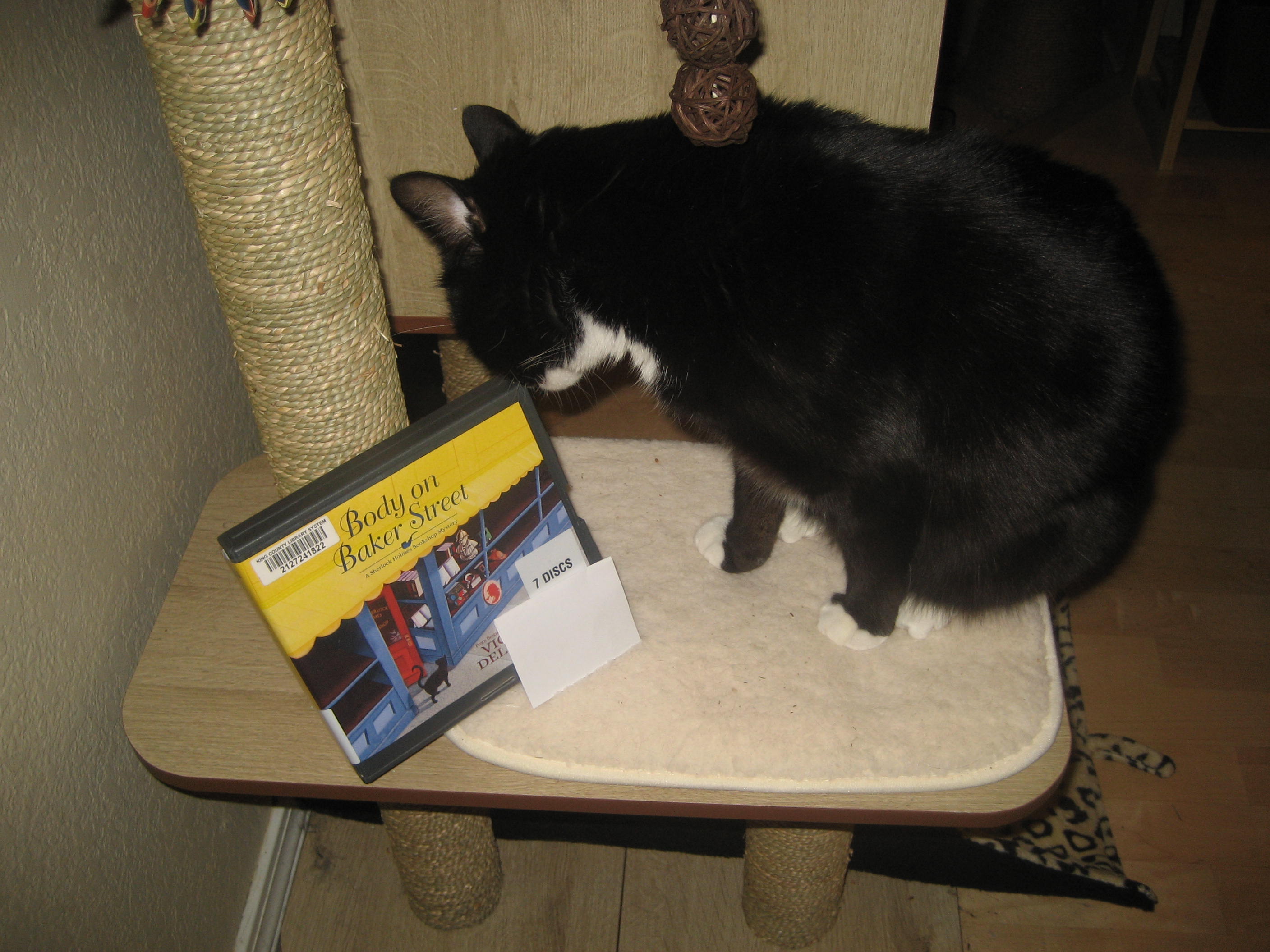 This would be a fun quick read. I am fortunate to have a public library with an amazing audio book selection. I had a very pleasant week commuting to the day job while I listened to this book. Burt’s checking out the audio book in the photo above. He’s curious about a cat that helps solve a murder investigation, but curiosity did kill the cat.