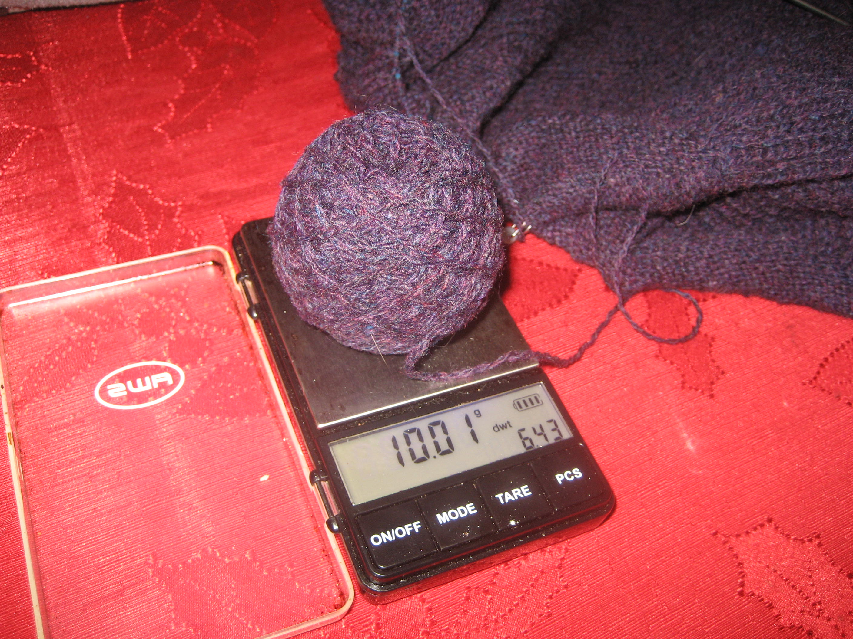 My Plum Biased Wrap is growing. The first skein of yarn is down to 10.01 grams of yarn. It looks small, but that’s still several movies worth of yarn to get through.