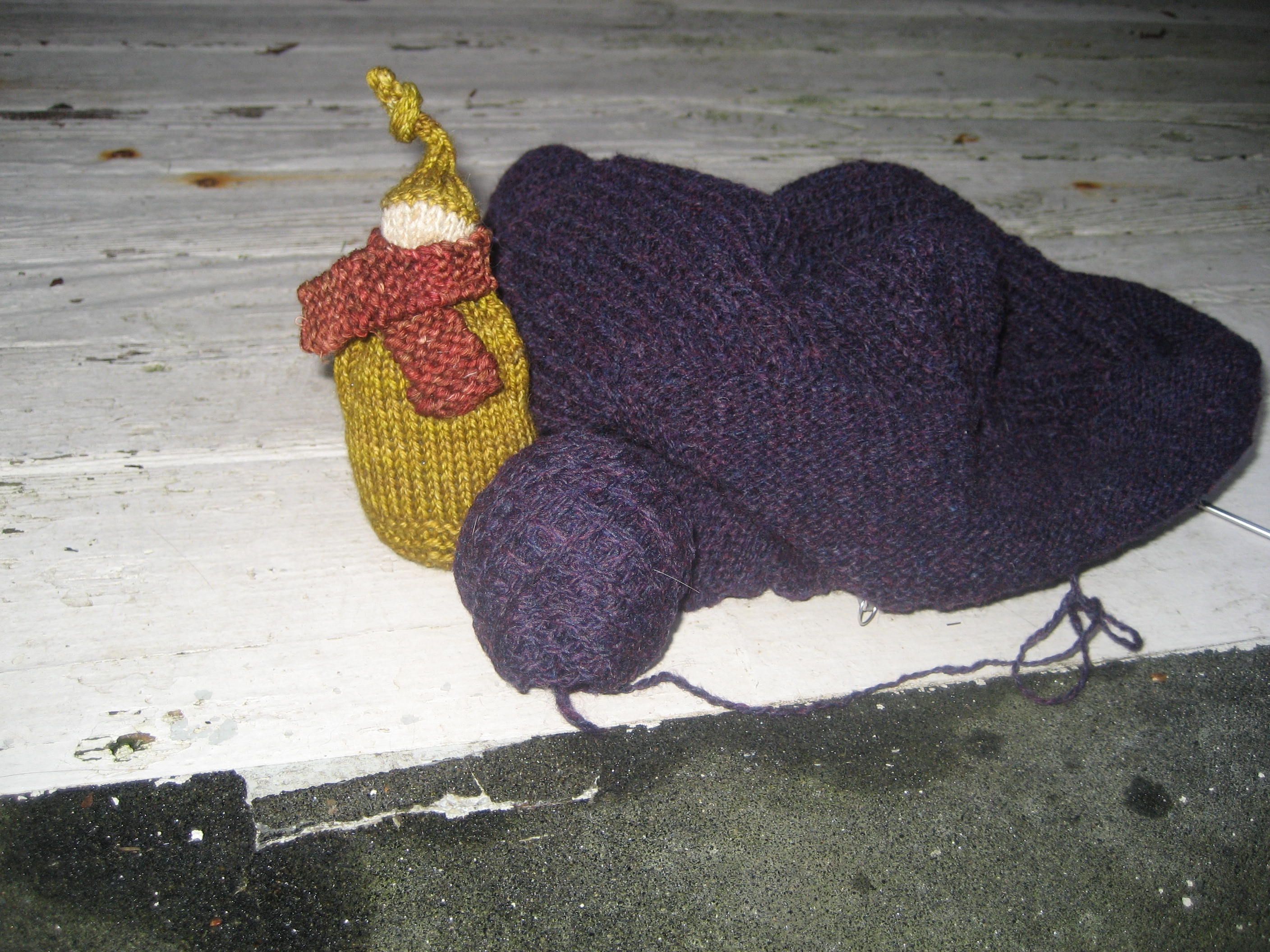 Another two hours of progress on my Plum Bias. The first skein is getting smaller and smaller. It’s now 6.71 grams. Look, even the Christmas elf is bigger than the first skein.