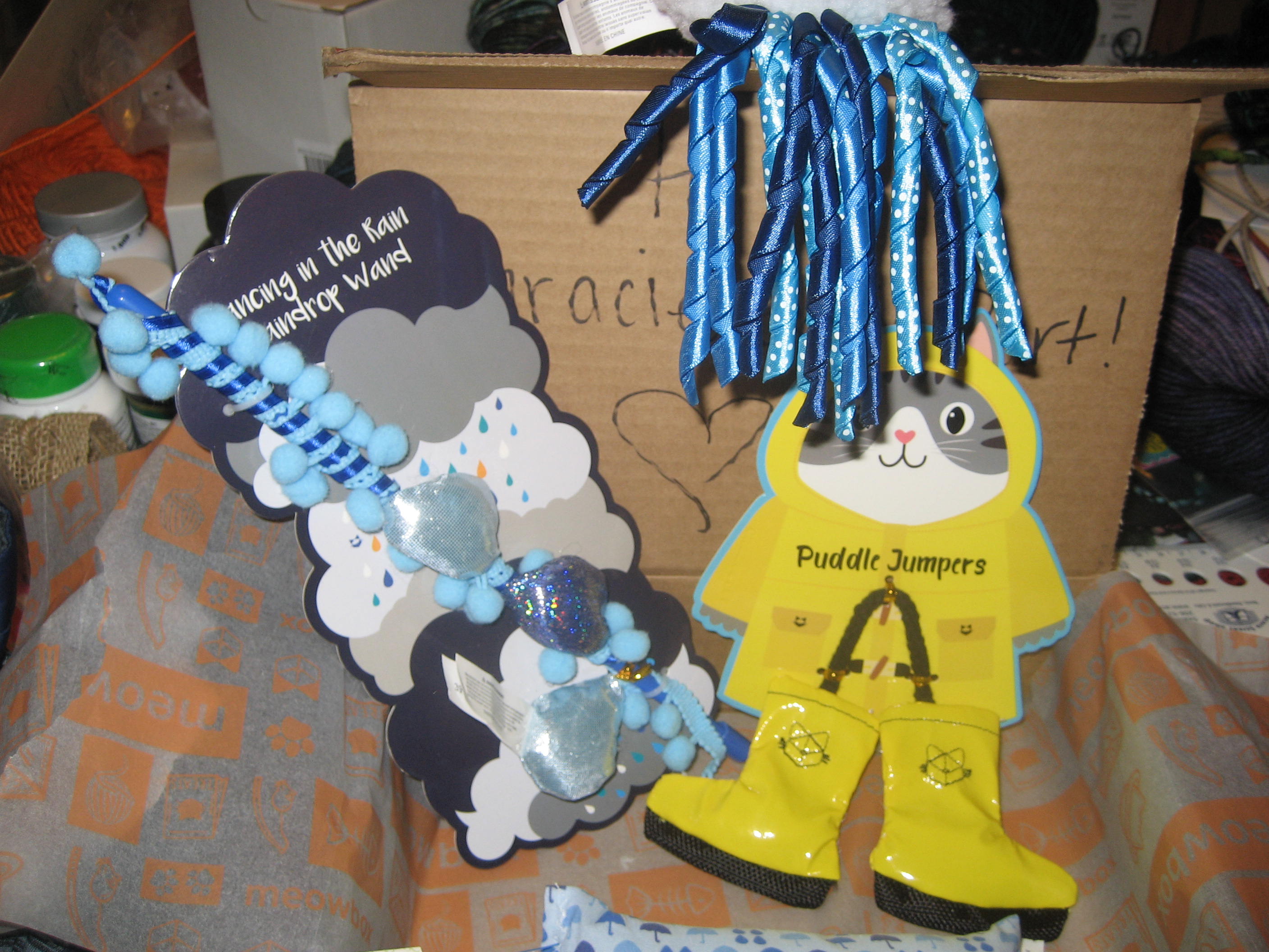 The birthday treats continue for the kitties. Their meowbox arrived today. Look at all their new toys. A rain themed box is very fitting for the PNW.