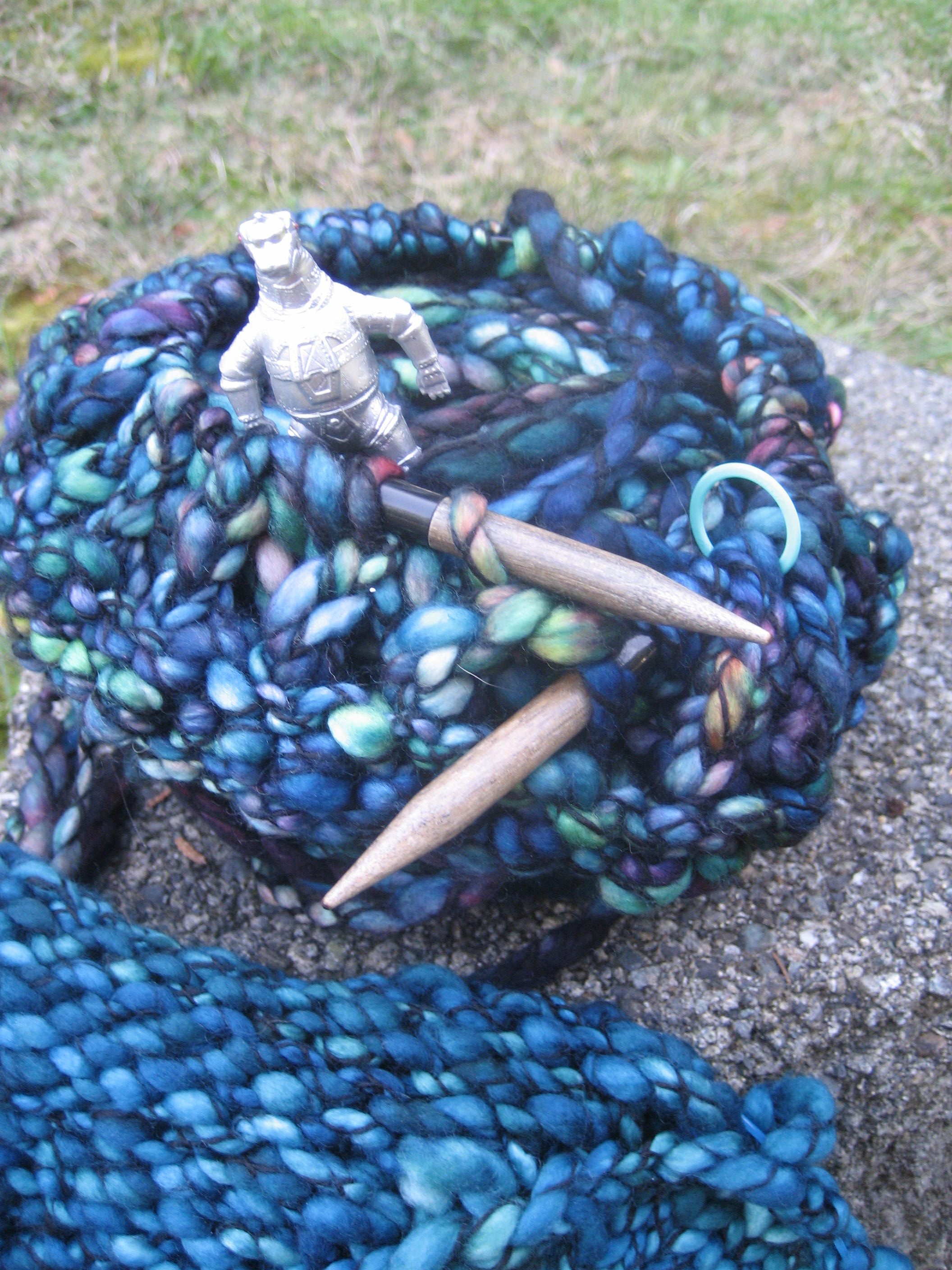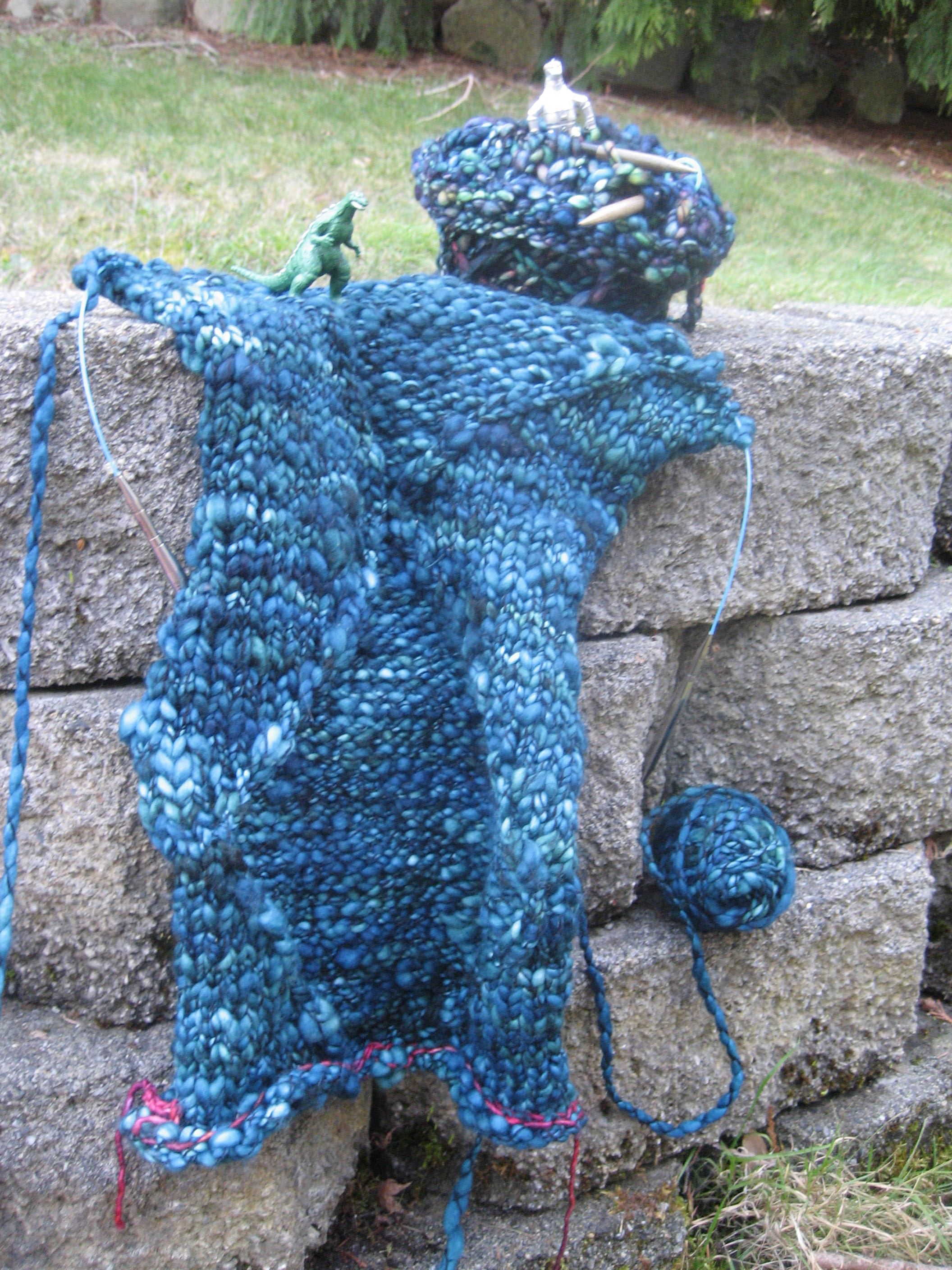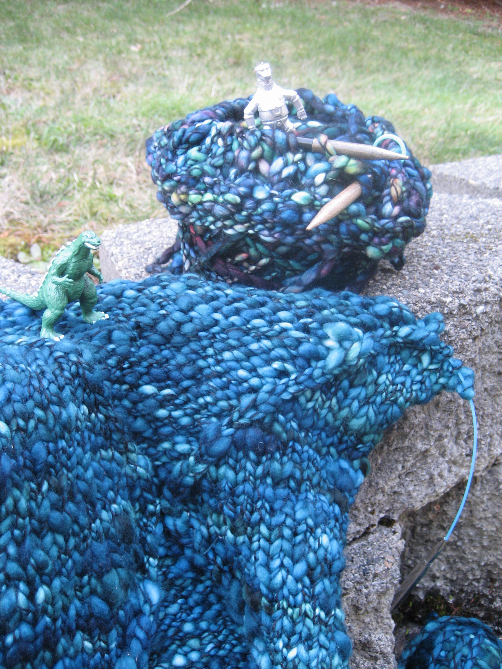 Bulky knits are great for reading subtitles. I’m making progress on Teal Feather Gluhwein. Naturally, I had to cast on a new project for Malabrigo March. I think this is project number nine so far this month. Here’s the start of Perky Little Camaleon. I just might manage to finish one of these during the next Godzilla movie.