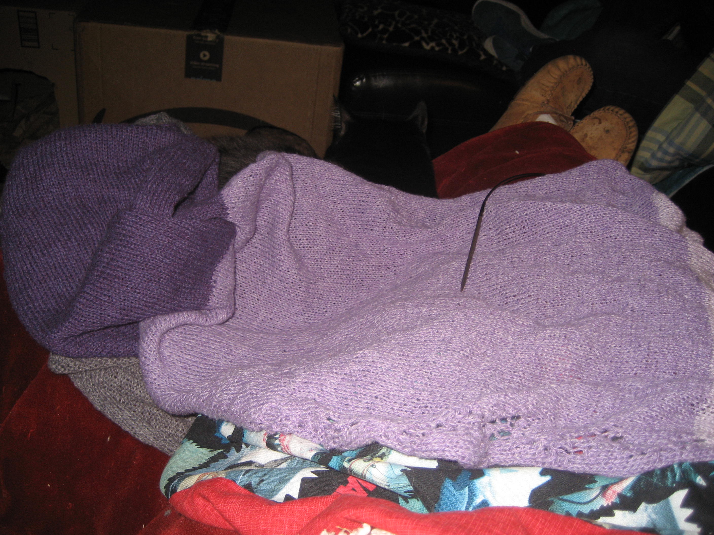 I’ve been making slow, but steady progress on 1500 yards of adventure knitting. If I could go back in time, I would have cast on more stitches so this would be wider instead of longer. It would make a lovely lap blanket, but I’m not sure how I’m going to wear a wrap that’s going to end up longer than I am tall. Perhaps, I need to gift it to a really tall person that also likes purple?