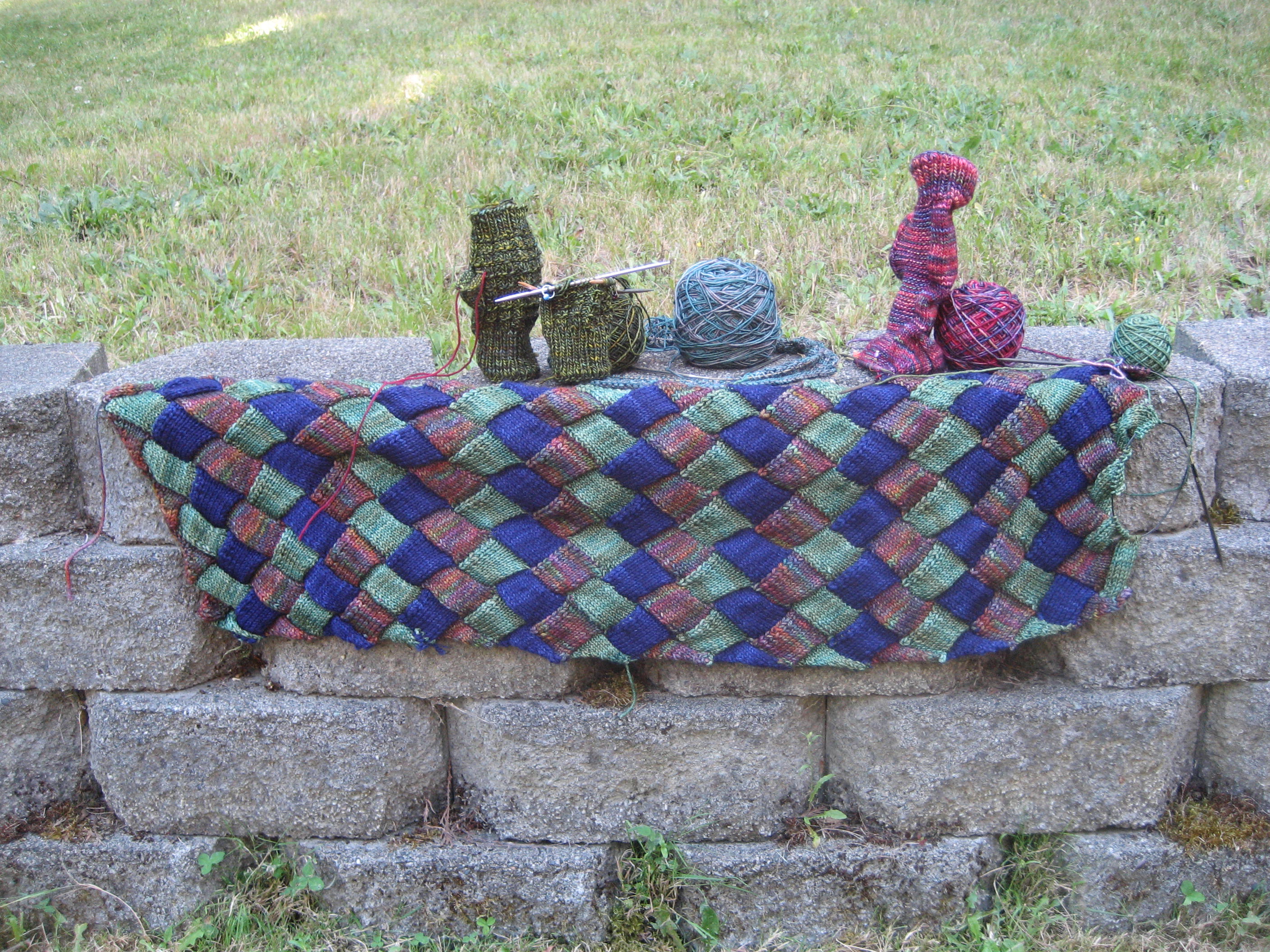 - Malabrigo Entralac – This will be a bit of a marathon knit. I’m still knitting one square daily and two squares on the weekends. This measures 34 inches so far. I’ve started repeat number 10.