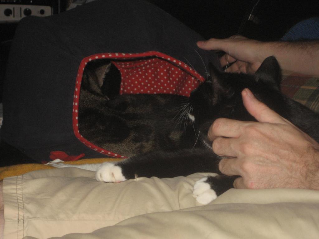 Cat politics going on here. Ernie managed to snag the coveted sleep spot, but that does mean he sacrifices on pets, chin scratches and belly rubs.