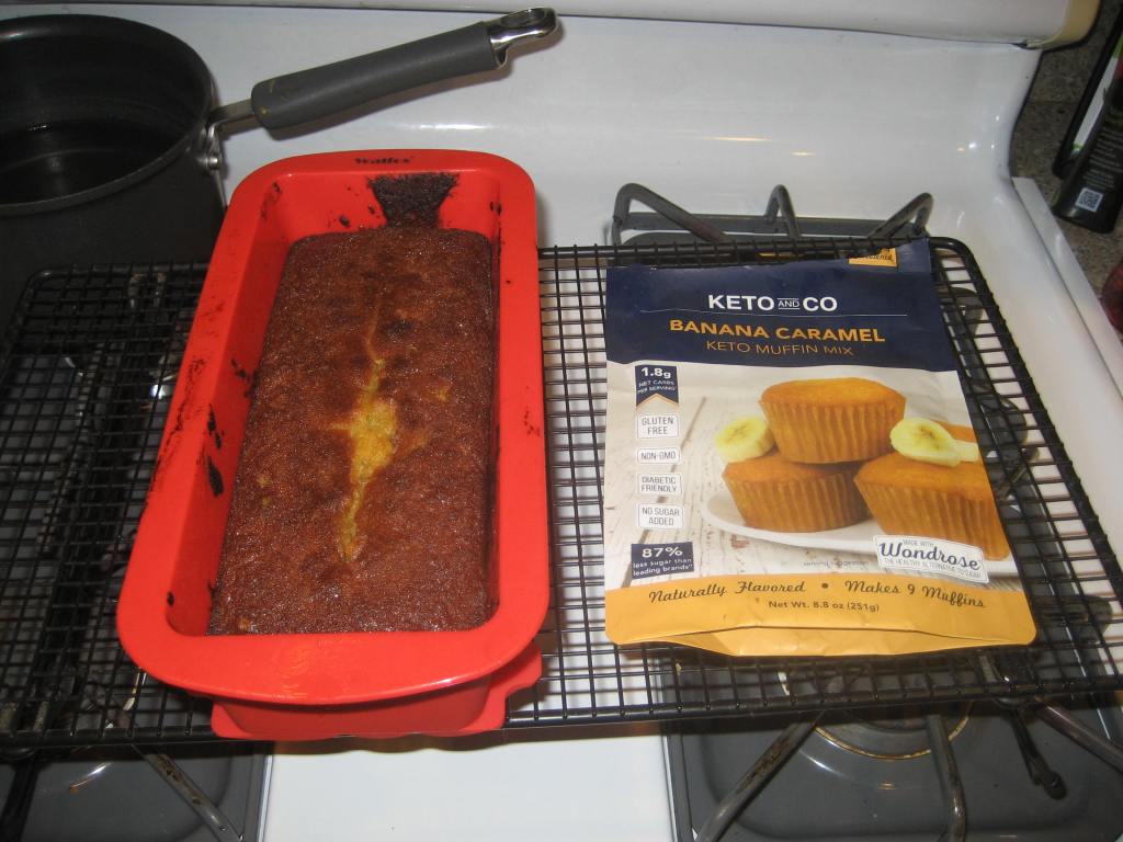 We’ve had great success with keto brownies. One batch was flavored with orange extract and another with coconut extract. Both were fantastic. The plain wasn’t bad either. We preferred the coconut flavoring best. This week, we’re trying banana caramel tea cake. It called for muffins, but the British Hubby couldn’t be bothered to measure out for muffins.
