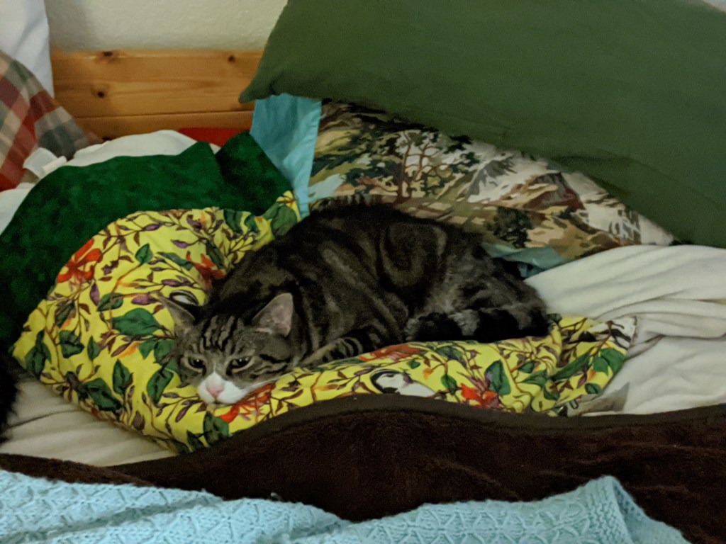 The cast on called for 246 stitches. With such a sticky yarn, I made an executive decision to cast on with a substitute yarn and switch to the main color on row one. As there is no knitting police, I decided casting on 246 stitches would take long enough why make it more challenging with sticky yarn? While it is slightly noticeable now, once the shawl grows I don’t think it will be that obvious. You can check out the details on Craftvent II. Day 2 only has 5 rows, but it takes some time to knit long rows.