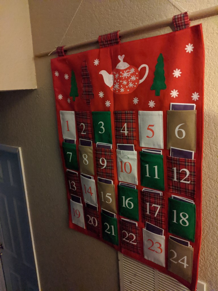 What’s better than doing one tea advent calendar? Two tea advent calendars. As you can imagine, I have a few different tea suppliers. Plum Deluxe is one of my favorites. I subscribe to their monthly tea membership. The calendar above is from them. The first photo shows day two teas: Vanilla Rooibos and Blackberry Toddy (I’m excited to try that one). This advent calendar is lovely since it’s reusable. If you’re crafty, you could also make this yourself with felt and simply purchase the tea fillers or whatever your heart desires.