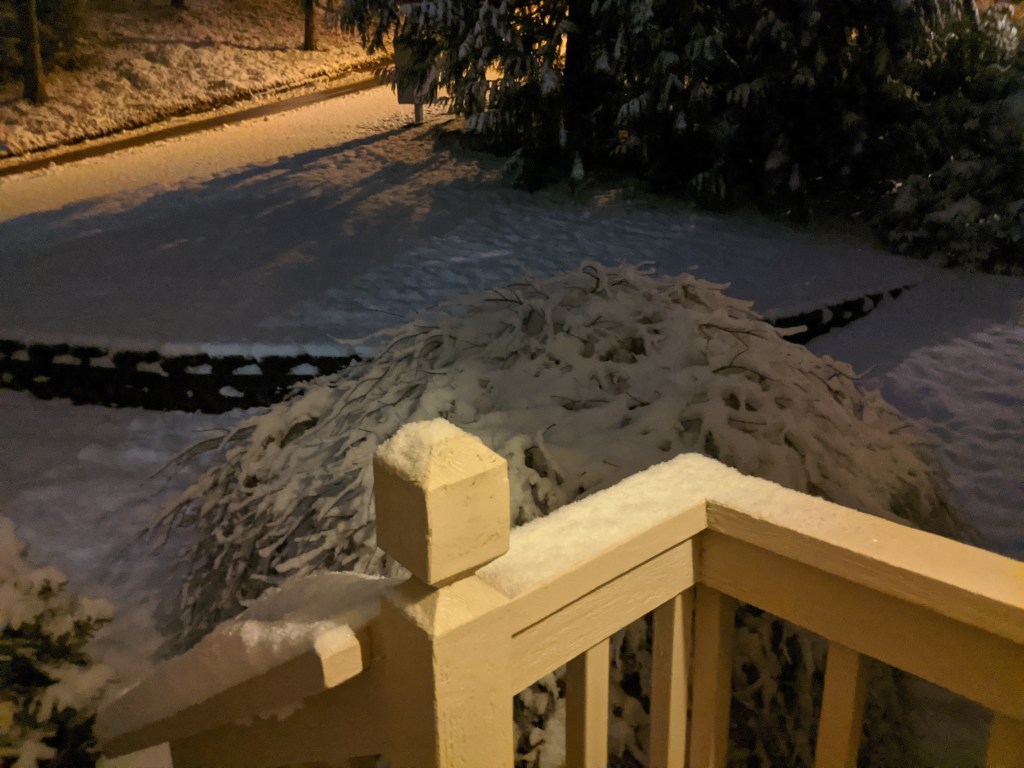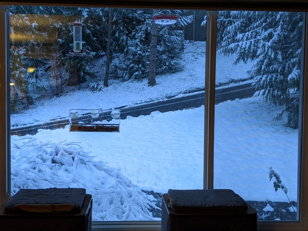 It’s the first snow day of 2020. It’s rare my house has snow in January. Yes, it’s winter and it’s cold, but normally the snow level stays at a higher elevation. Traditionally, we’ve not been house bound until February, but an arctic storm front came through with below average temperatures and snow. Here’s the winter scene we found upon waking: