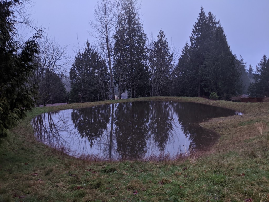 Fortunately, we live up hill from a storm drainage pond. Normally, it’s empty or has a few puddles. Above you can see just how full it is. My neighborhood is several decades old with houses about the same age as me. This is the fullest it’s ever been since being created. I think the rain is going to slow before this over flows.