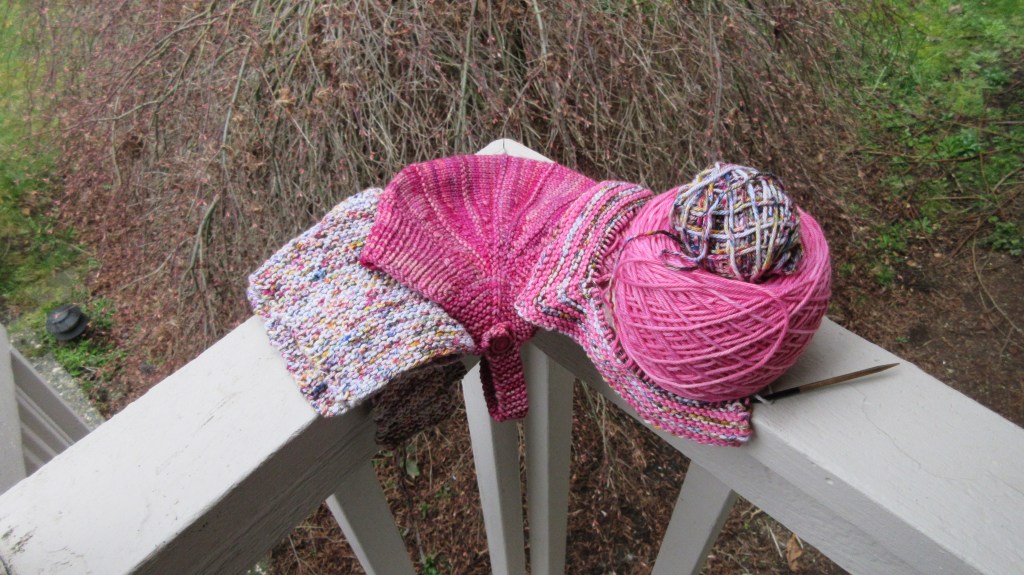 - Malabrigo Delight – I’m using Impatient Pink and Summertime in Verano to make Delightful Dishcloth. I used the two tail method using both yarns to cast on. It made a rather interesting stripe. This is part of a set for a new mom.