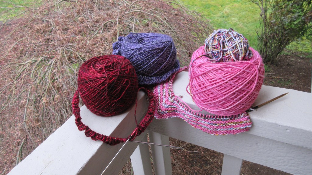 - Dewberry After Dark – I’ve wanted to knit this robe for over a decade, but could never find just the right yarn. And it wouldn’t be Malabrigo March if I didn’t cast on something in Dewberry. The pattern is After-Dark Robe.