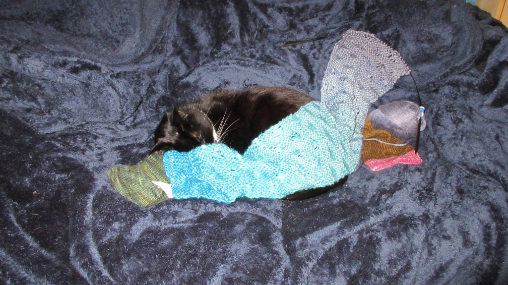 I’m making great progress on Pacific Sky Scarf. I’ve decided this will be a gift for a dear co-worker that has a birthday coming up in June. While I won’t be able to see her since we’re all still working from home, I can send a birthday surprise in the mail. I think people appreciate getting snail mail with a hand written note these days. Burt makes such a great model for this scarf.