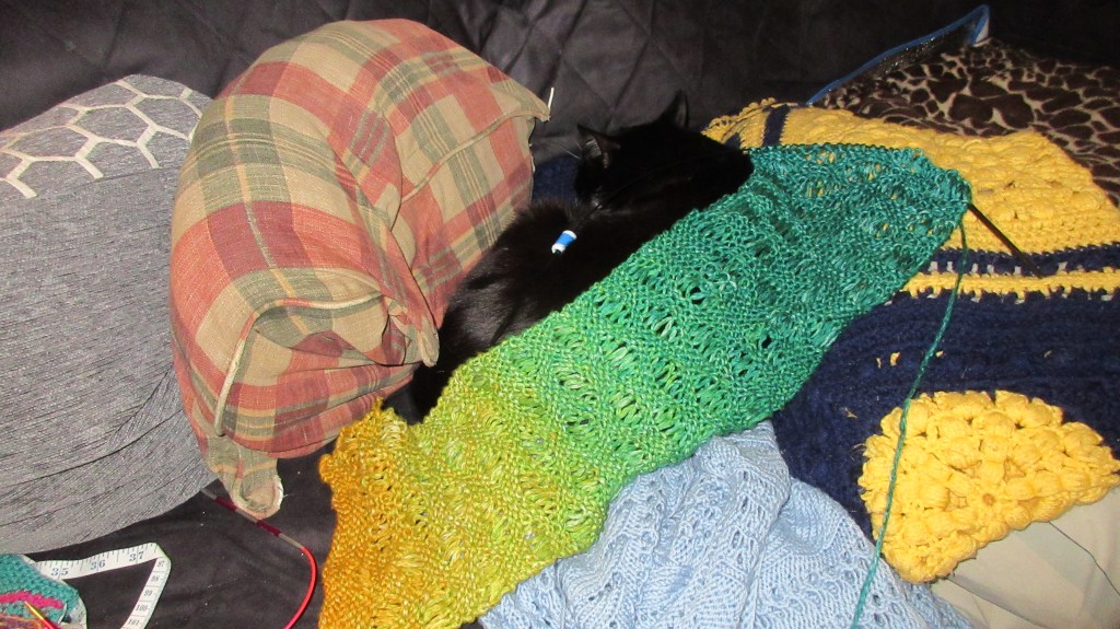I’m making progress on Aurora Borealis scarf. Burt makes a fantastic model.
