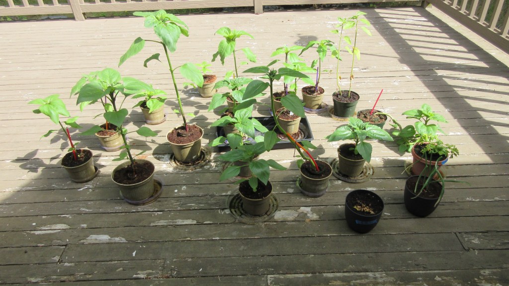 Our sunflower garden is flourishing. I’ve decided to keep them in pots for now so we can enjoy their beauty while in my kitchen home office space. The plants won’t get as big, but they should still flower. I think a few already have buds.