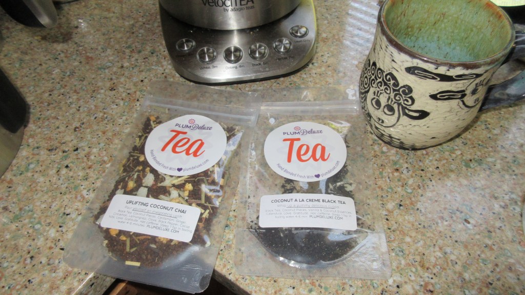 I often read with a cuppa and a kitty. This week I’ve been enjoying coconut blends from Plum Deluxe. The PNW has a good variety of tea shops. Plum Deluxe has become one of my favorite. It’s home to my monthly tea subscription and tea advent calendar. This week’s favorites are coconut a la crème black tea and uplifting coconut chai. What’s your favorite tea?