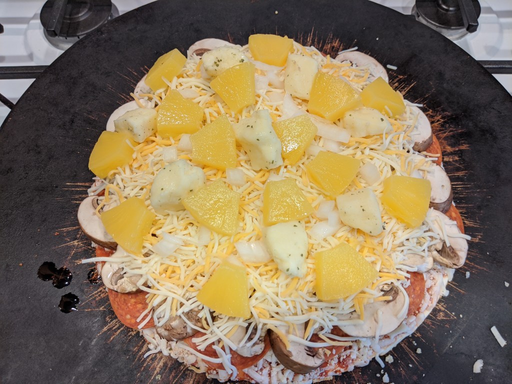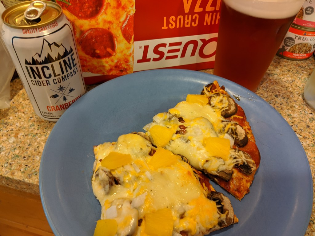 We had a treat for pizza toppings this week. Pineapples! Most fruit is forbidden on a low-carb keto diet. It just has too much sugar. We have berries from time to time, but we try to pack our diet with more veggies than carbs. In the summer, that’s hard with all the fresh fruit in season. I can’t remember the last time I had pineapples. It was fantastic with my cranberry lime cider and the garlic cheese curds. Yum!
