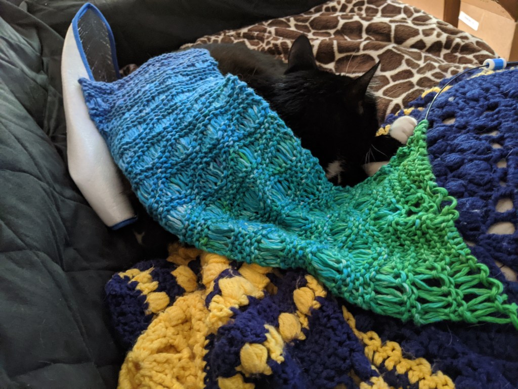 I’m making slow, but steady progress on Great Reef. Burt is such a great model. His tuxedo markings really make this bright yarn pop.