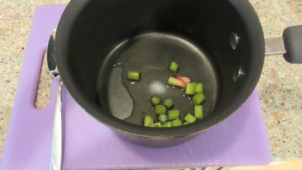 I was very excited and almost woke up the British Hubby to show him our first rhubarb stalk. Completely organic I might add! Sipping my cuppa, I decided perhaps my enthusiasm could wait for the British Hubby to wake up on his own. (More likely when Ernie decides the British Hubby should be snuggling with him.) What to do with my treasure!? With some help from my neighbor’s garden, I decided to make rhubarb compote. My one little stalk wasn’t quite enough.