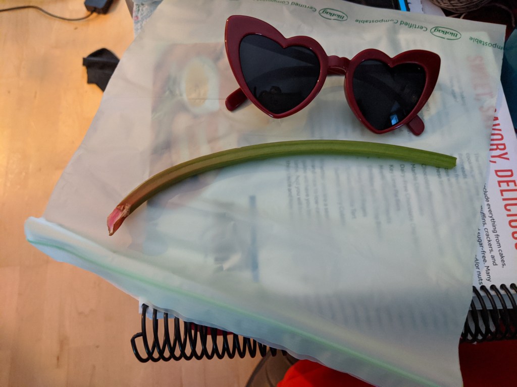We had some excitement over the weekend. During my morning routine while my first cuppa is steeping, I check out how the container garden is doing overnight. Some mornings I also get to greet our new deck frog. On Saturday, I discovered one of the rhubarb leaves had flipped over and was disconnected from the main plant. I suspect the leaves get too heavy for the stalk while our plant is still getting established.