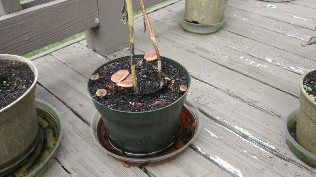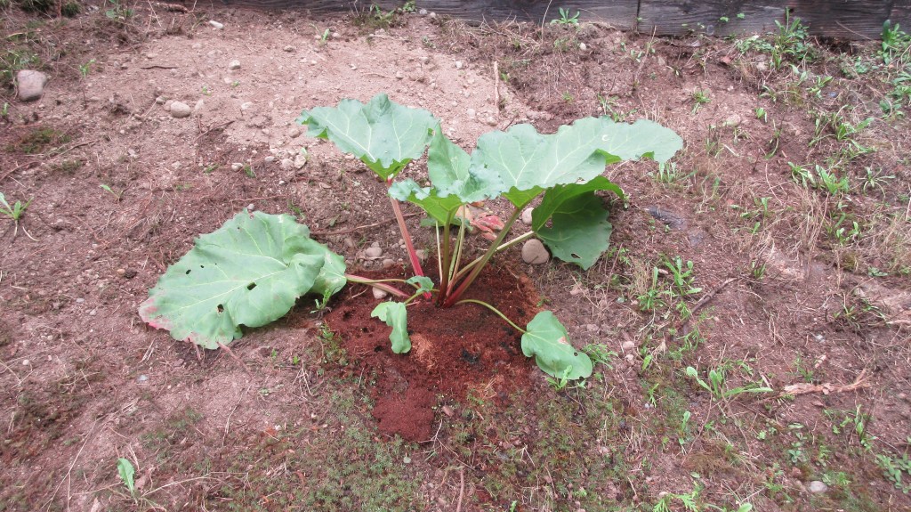 Garden Update: We finally managed to plant the rhubarb in it’s forever space. Wish it good luck that it survives the transplant. I would dearly love to have my own supply of fresh rhubarb next spring. We also spotted some mushrooms growing in my sunflower pots.