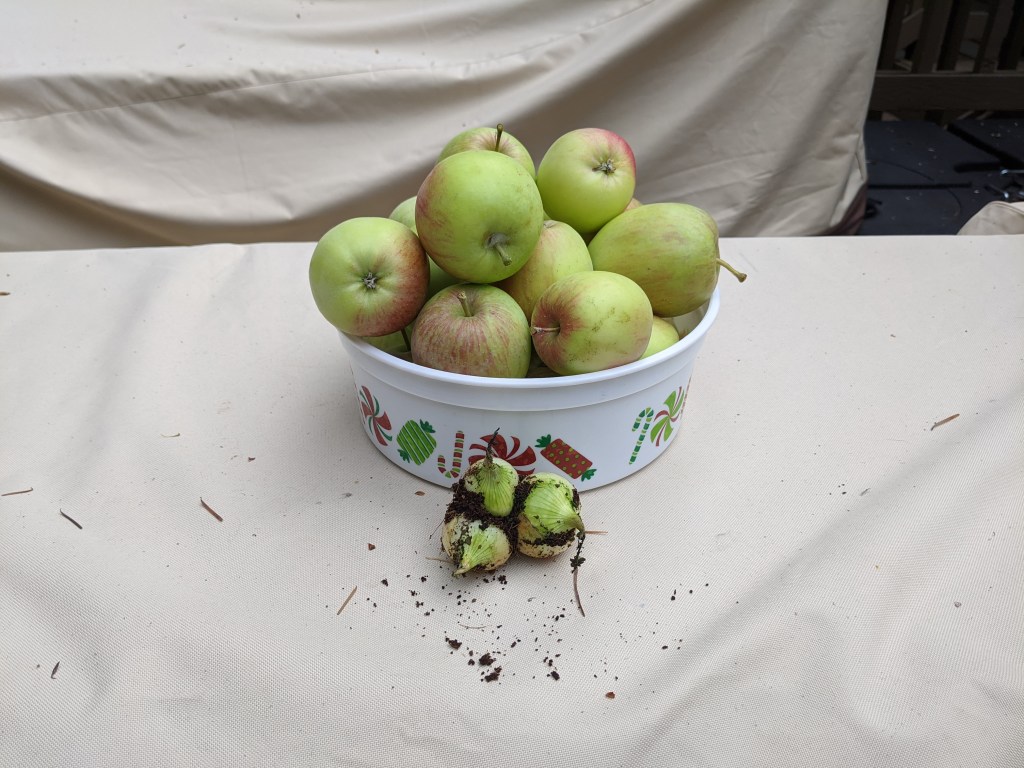 This week I’m celebrating our fall harvest. A few months ago, we were excited to see how many apple blossoms and potential apples. We harvested 28 apples! Not a ton, but enough to enjoy as a snack with some nuts or cheese. We also harvested three onions! This what we go from planting the end of a regular onion. Now, I realize I should have split the sprouts to provide them with more space to grow. I’ll know for next time.