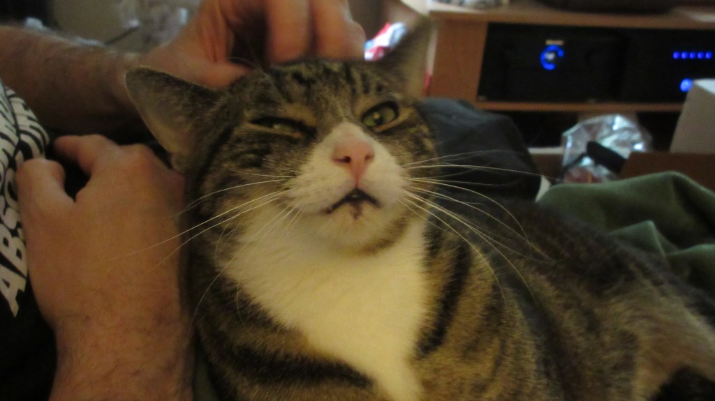 I leave you with a close up of our favorite tabby kitty, Ernie, getting some head scratches. He likes to celebrate with snuggles and a kitty massage.