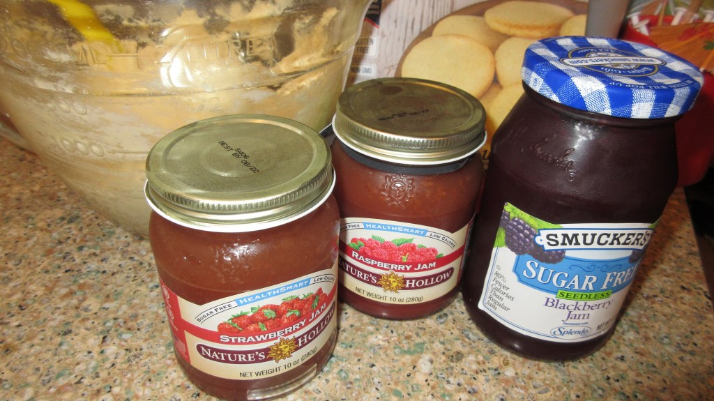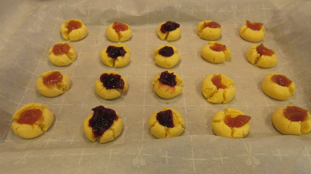 Since the British Hubby doesn’t have his appetite back, we decided to make small bite sized keto desserts this week. Introducing jam thumbprint cookies. We started with a mix and sugar free jam, but you could easily make this entire recipe from scratch. Our first batch were too small. We had more cookie mix left than we should have. I don’t mind the smaller cookies. Since I don’t have a huge sweet tooth so these are perfect for me. Some of them leaked a bit, but they still taste fantastic. With a little more practice we might just be ready for the Great British Bake-off! (Okay, a lot more practice.) I also think this is a good base recipe you could easily change the flavors to make for various holidays with low-carb chocolate, caramel sauce or peanut butter. The possibilities are endless really.
