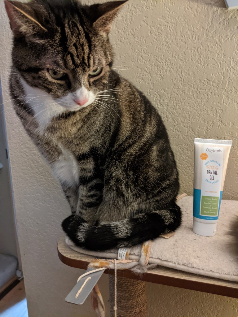 Kitty Dental Update: We still have a few more products to try, but this one seems to a winner both on easy of use and how it’s working. This is a dental gel that smells a bit like an aloe vera plant. The kitties aren’t big fans, but it’s not too difficult to distract them and put a dab on their gums. So far, it’s helping with the terrible kitty breath. We’ll see how the next check-ups go.