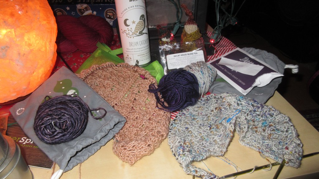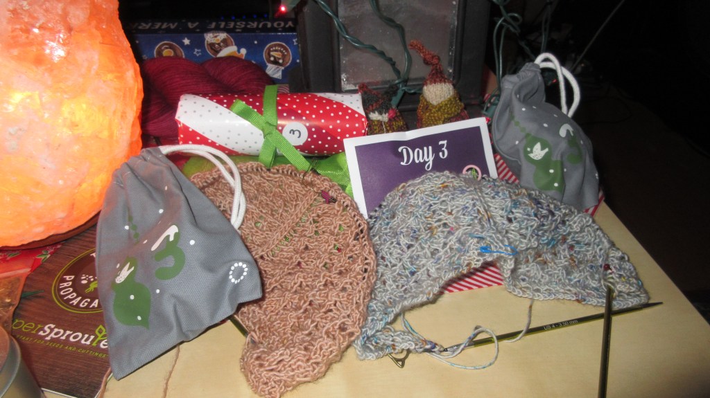 - Day 3: Yarn for first transition section. My crafters self-care advent calendar had Dream Catcher tea from Flying Bird Botanicals. I had to laugh because the last thing I need right now is more tea, but I’m always excited to find new local businesses. Flying Bird Botanicals has drinking chocolates in interesting flavors along with honey, matcha and tea. I see more of this brand in my future. Since this took less time to knit, I only managed to get through two packages of advent calendar tea: Spiced Apple Chai from Adagio and Lizzy’s Breakfast Supreme from Lizzy Kate. The breakfast supreme was a great pick-me-up for sluggish mornings when I need to be alert for the day job.