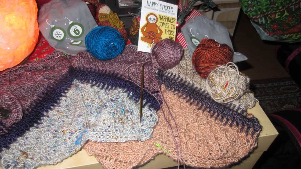 - Day 3: Yarn for first transition section. My crafters self-care advent calendar had Dream Catcher tea from Flying Bird Botanicals. I had to laugh because the last thing I need right now is more tea, but I’m always excited to find new local businesses. Flying Bird Botanicals has drinking chocolates in interesting flavors along with honey, matcha and tea. I see more of this brand in my future. Since this took less time to knit, I only managed to get through two packages of advent calendar tea: Spiced Apple Chai from Adagio and Lizzy’s Breakfast Supreme from Lizzy Kate. The breakfast supreme was a great pick-me-up for sluggish mornings when I need to be alert for the day job.