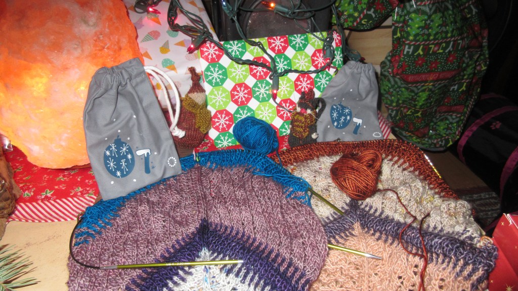 - Day 4: A project bag and Craftvent 2020 pins that became ornaments. This time I drank two teas from Plum deluxe. (In case you were wondering, I’m not drinking the teas in the order I open them necessarily.) Fog Cutter black and Decaf House Blend both were scrumptious.