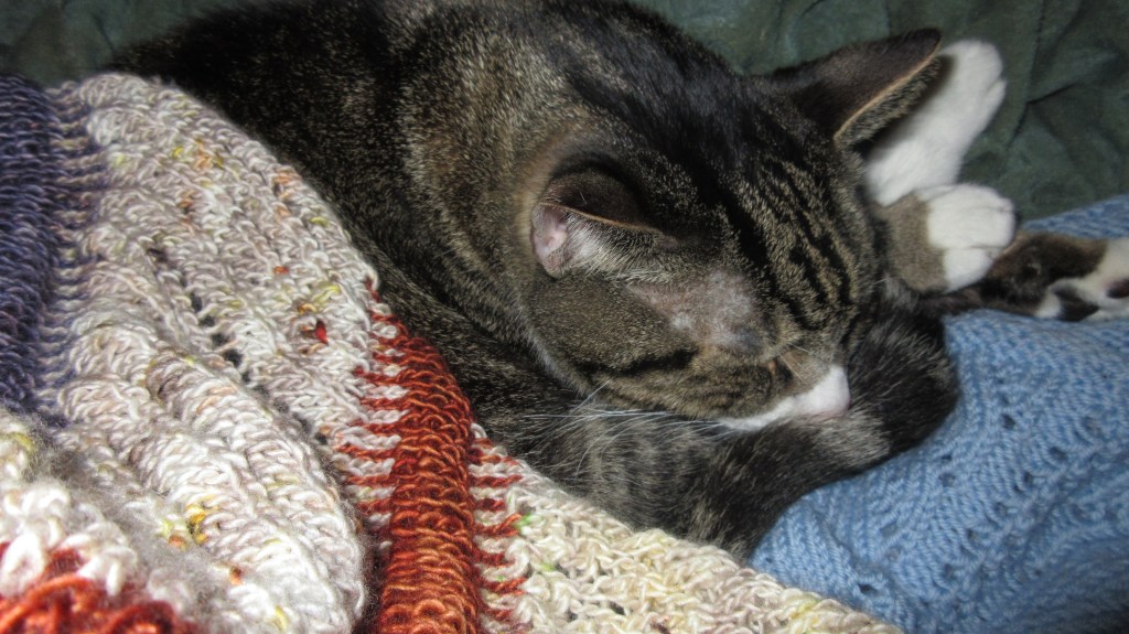Ernie couldn’t be bothered to wake up for this photo shoot. Can you blame him? He’s sleeping on a knitted blanket and scarf.