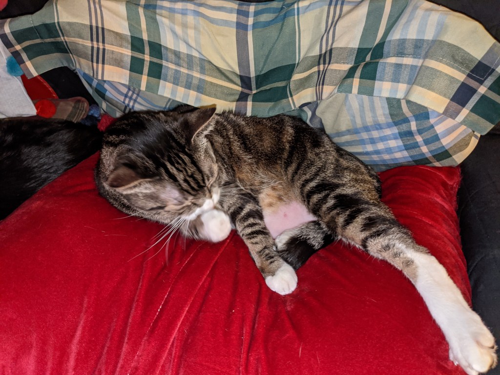 SkeinHerder Ponders: This week I’ve been mostly thinking about if the cats had Olympics what would their events be? Ernie is a gold medalist belly washer. He’s a solid competitor in over-all washing in general, but his belly is so clean it’s missing fur in places. Ernie also has a chance in the extreme snuggling event with extra marks for his free-style scarf impression.