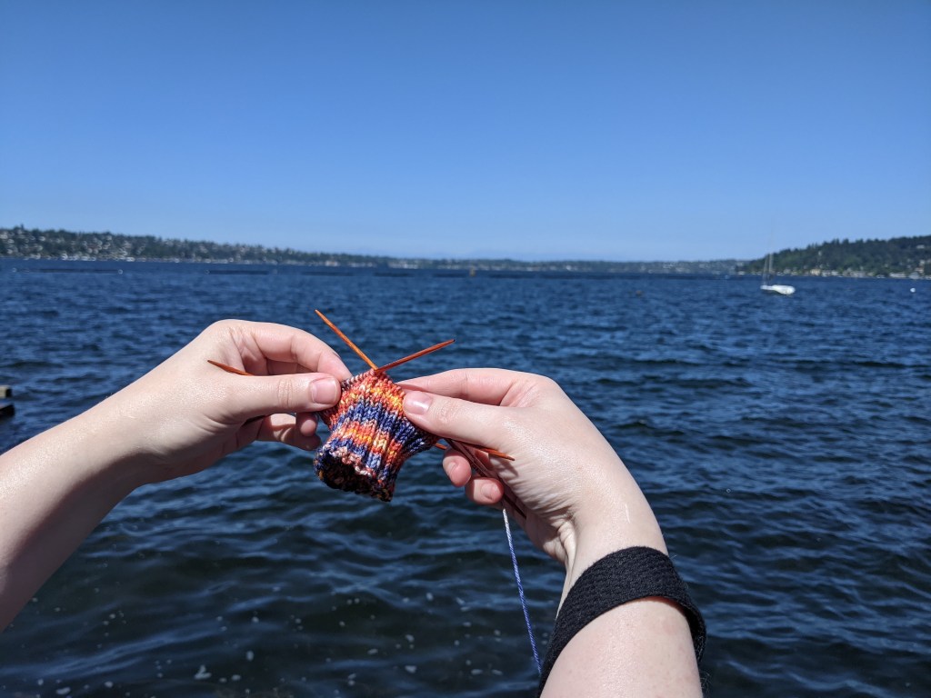 You can just make out the mountains in the background. We had a lovely walk before settling in a shady place to knit on my latest socks, Sunset in the PNW. The yarn is from my most recent yarnie adventure.